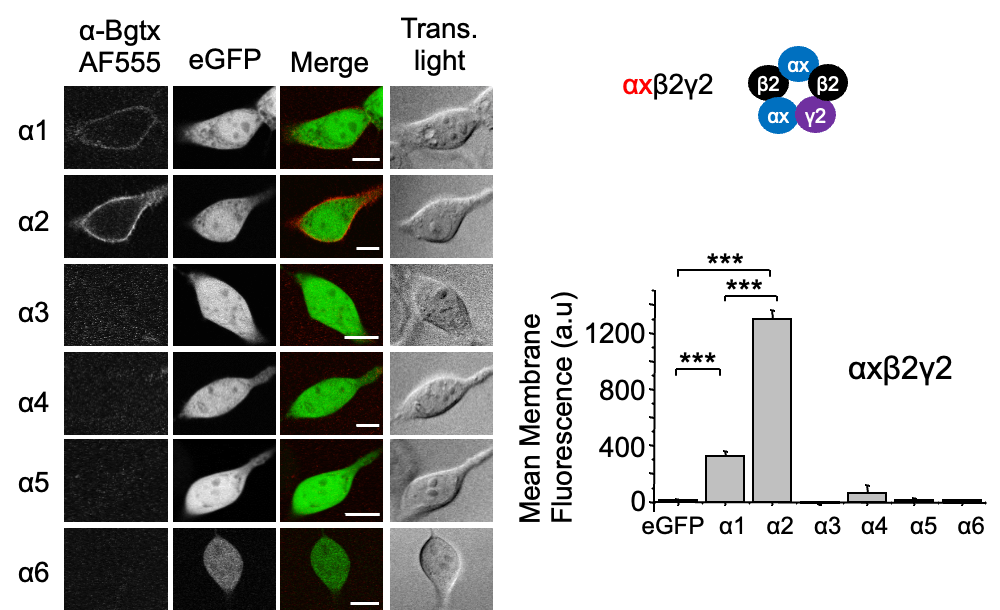 We investigated the binding of α-Bgtx coupled to Alexa-Fluor 555 (α-Bgtx-AF555) to cell surface receptors expressed in HEK-293 cells composed of an α subunit (α1-α6) with either β1γ2 or β2γ2 subunits. Of these combinations, α2 subunit-containing receptors demonstrated the highest cell surface staining with α-BgTx-AF555. Receptors containing α3/5/6 subunits and β1/2γ2 did not show any labelling with α-BgTx-AF555.