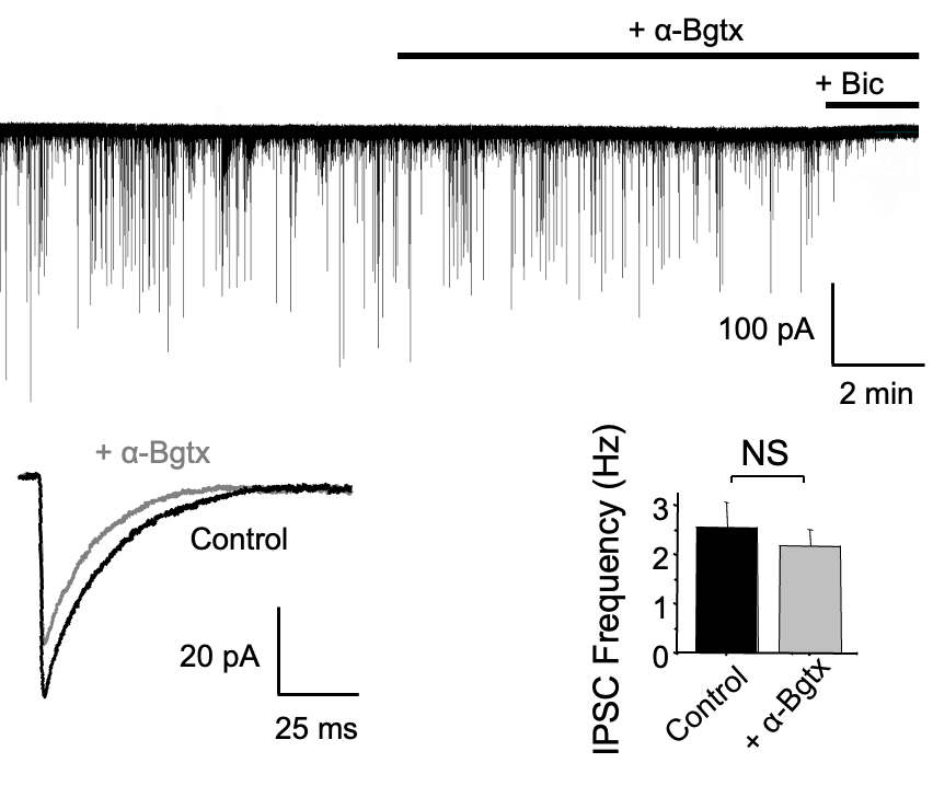 In dentate gyrus granule cells α-Bgtx reduced IPSC amplitude but not frequency suggesting that α-Bgtx inhibits endogenous synaptic GABAARs in acute hippocampal slices.