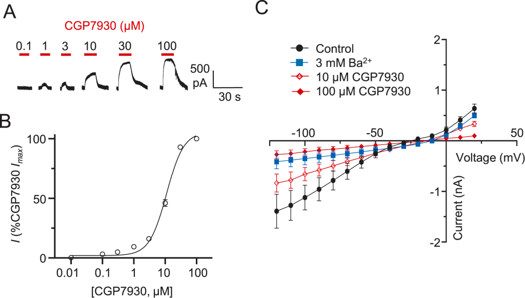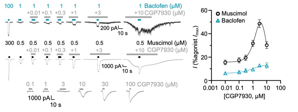 CGP7930 potentiated GABAA receptor currents in neurons and HEK-293 cells. At high concentrations, CGP7930 directly activates GABAA receptors and proceeds to inhibit these ion channels as concentration is increased.