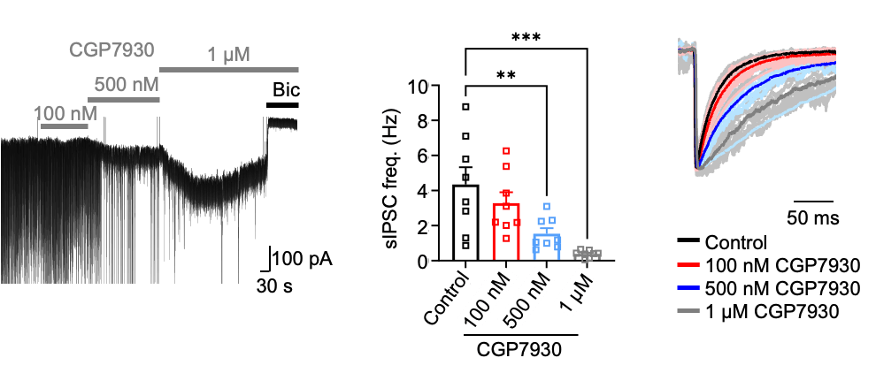 Applying 0.1, 0.5 and 1 μM CGP7930 reduced sIPSC frequency in a concentration-dependent fashion.