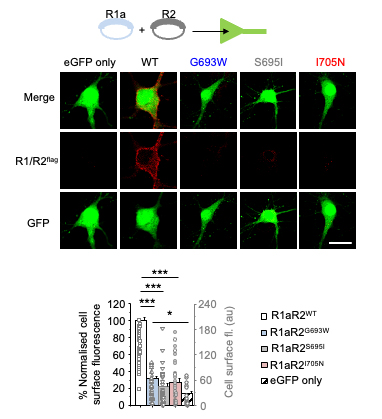 Here, we studied the biophysical, trafficking and functional profiles of three of these variants. By studing these receptors in neurons for the first time, we show that these variants fail to express on the cell surface of neurons and for at least one of the variants result in presynaptic hyperexcitability.