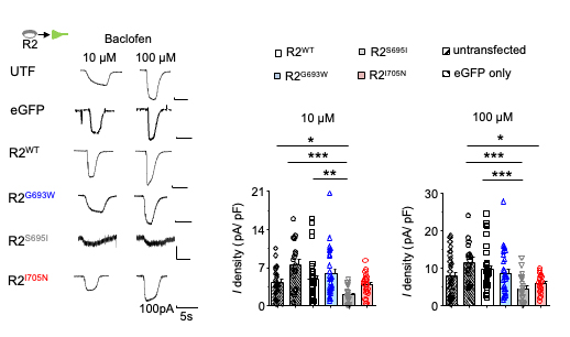 Using whole cell electrophysiology, we report that expression of S695I reduces GABAB receptor specific agonist baclofen activated K+ currents in hippocampal neurons