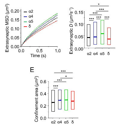 Analysis of the membrane diffusion profiles for extrasynaptic GABAA receptors revealed that δ-GABAARs were the slowest to traverse the membrane, surprisingly α5-GABAARs were fastest, and α2-and α4-GABAARs were ranked intermediate.