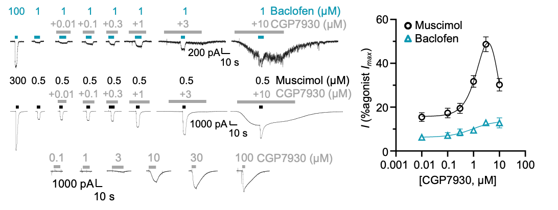 CGP7930 potentiated GABAA receptor currents in neurons and HEK-293 cells. At high concentrations, CGP7930 directly activates GABAA receptors and proceeds to inhibit these ion channels as concentration is increased.