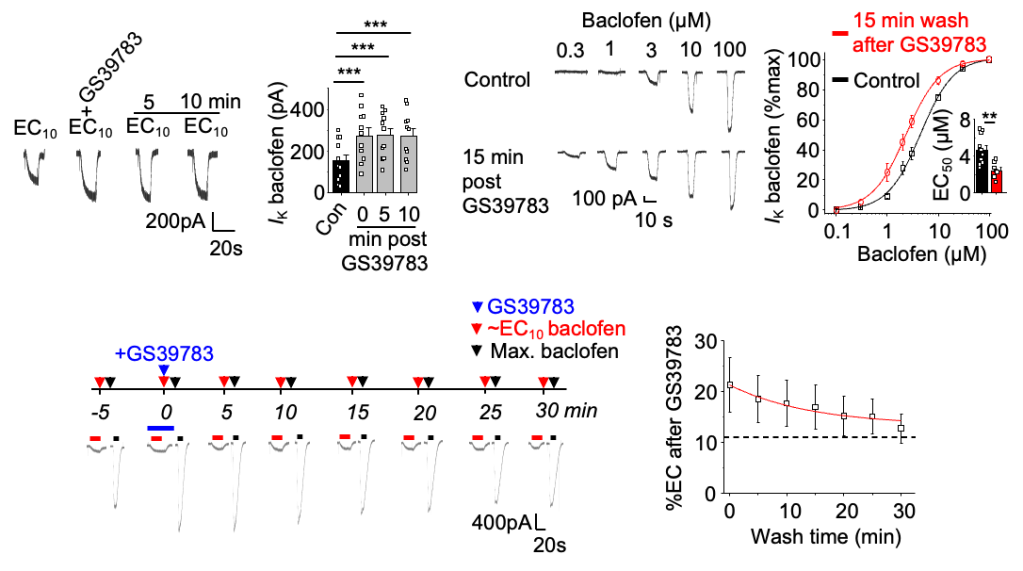 Intriguingly, the recovery kinetics for GS39783 potentiation during the wash-off phase, studied in GIRK cells by applying consecutive pairs of ~EC10 and maximal baclofen concentrations every 5 min following a single exposure to 3 μM GS39783, is similar to the rate of internalization for cell surface GABABRs in the same cells.